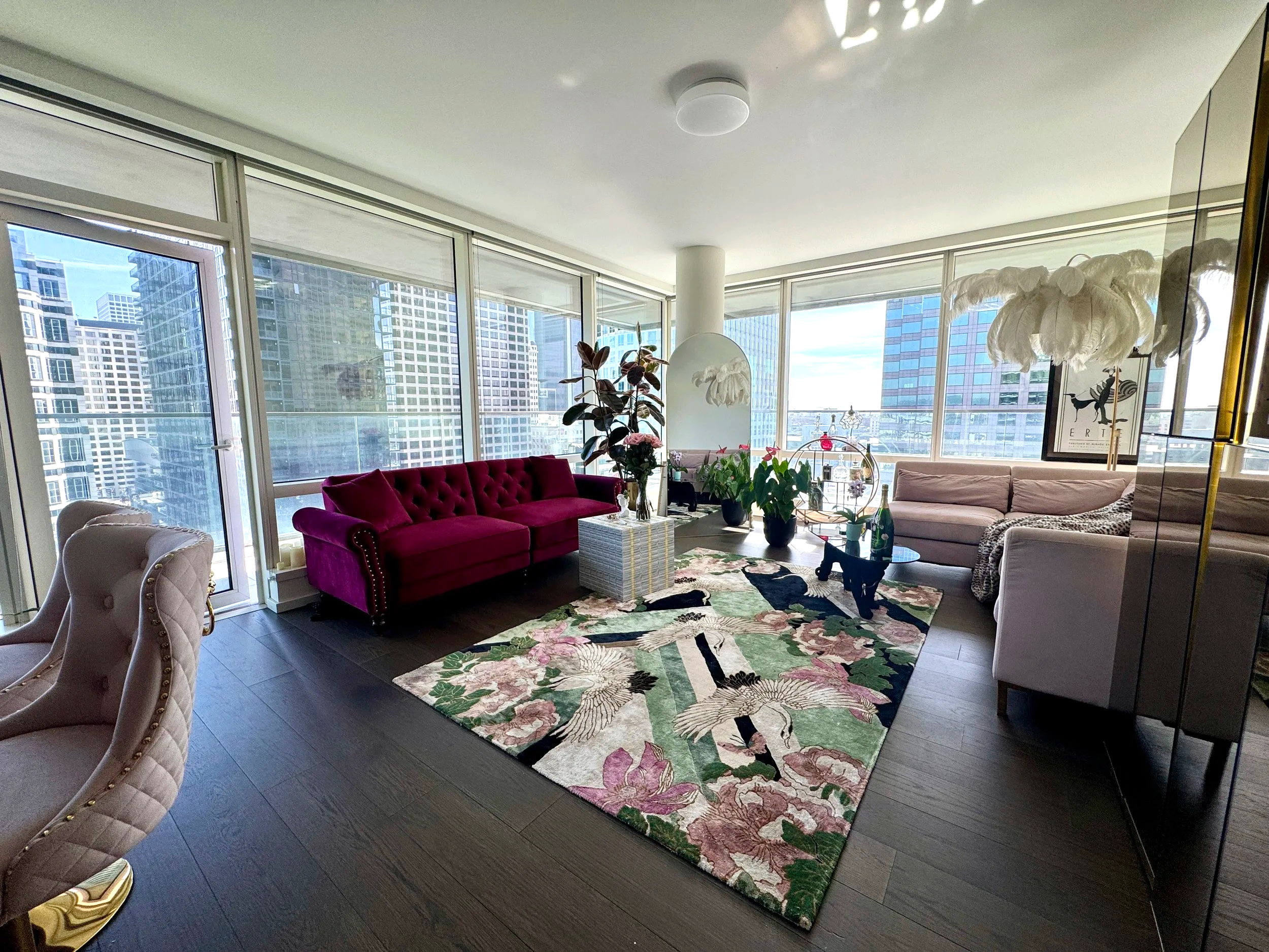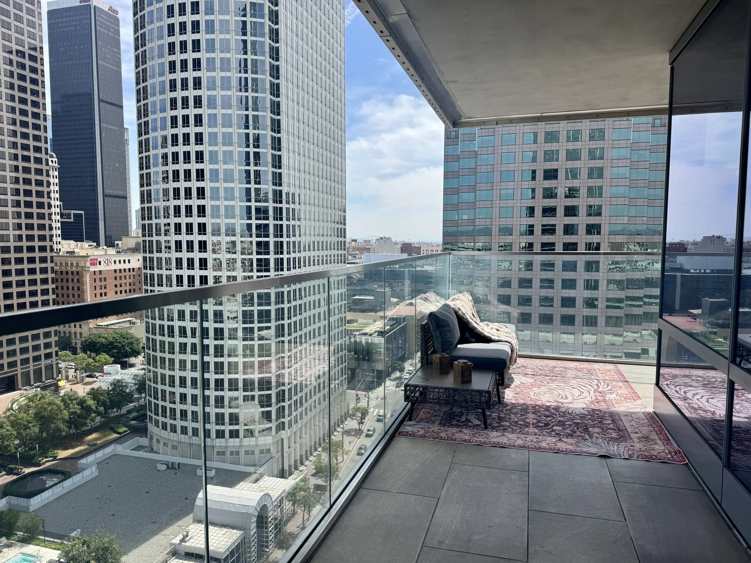 Floor-to-ceiling windows across two walls bring in consistent natural light throughout the day. At night, the DTLA city skyline becomes part of the set.