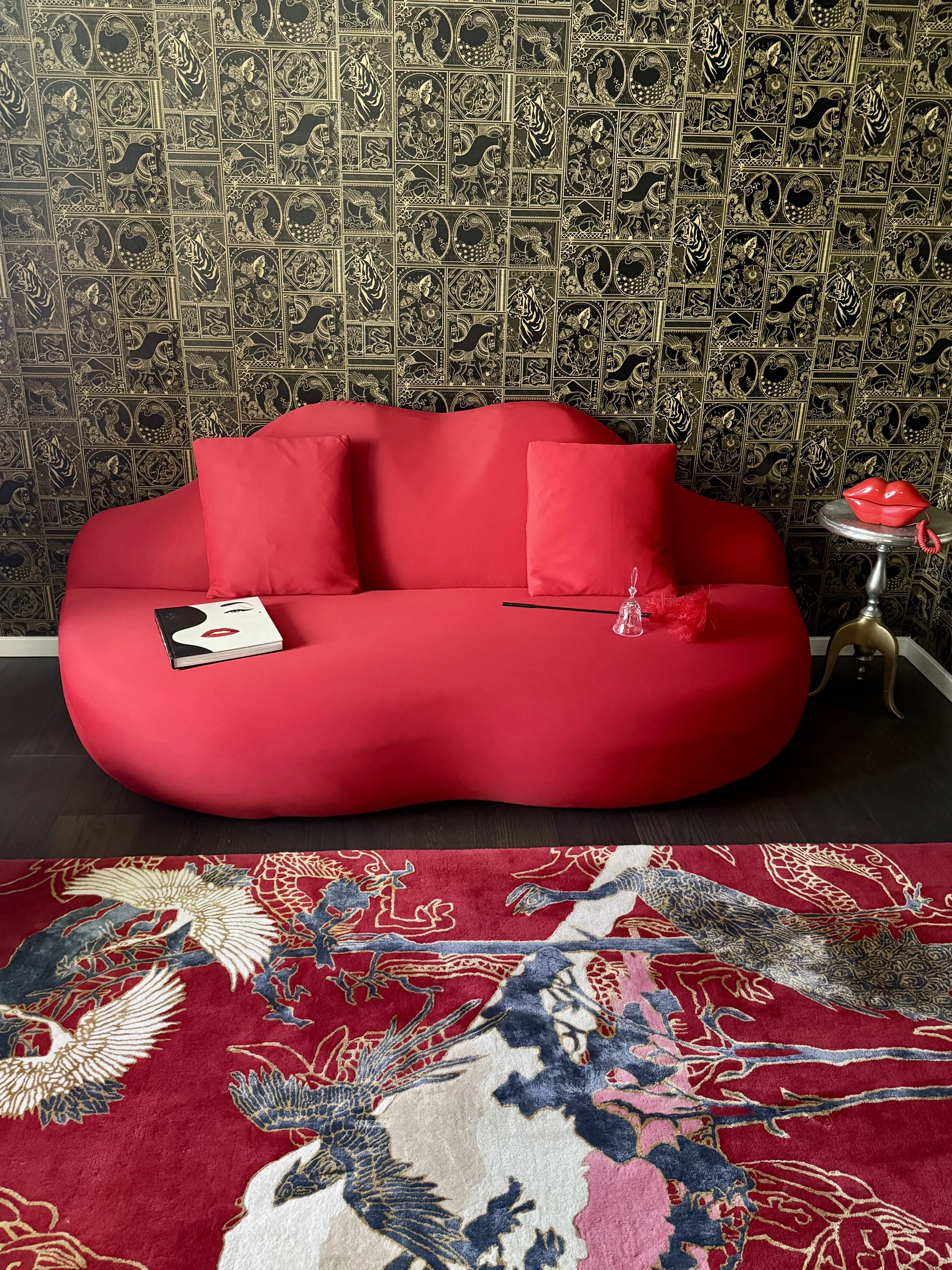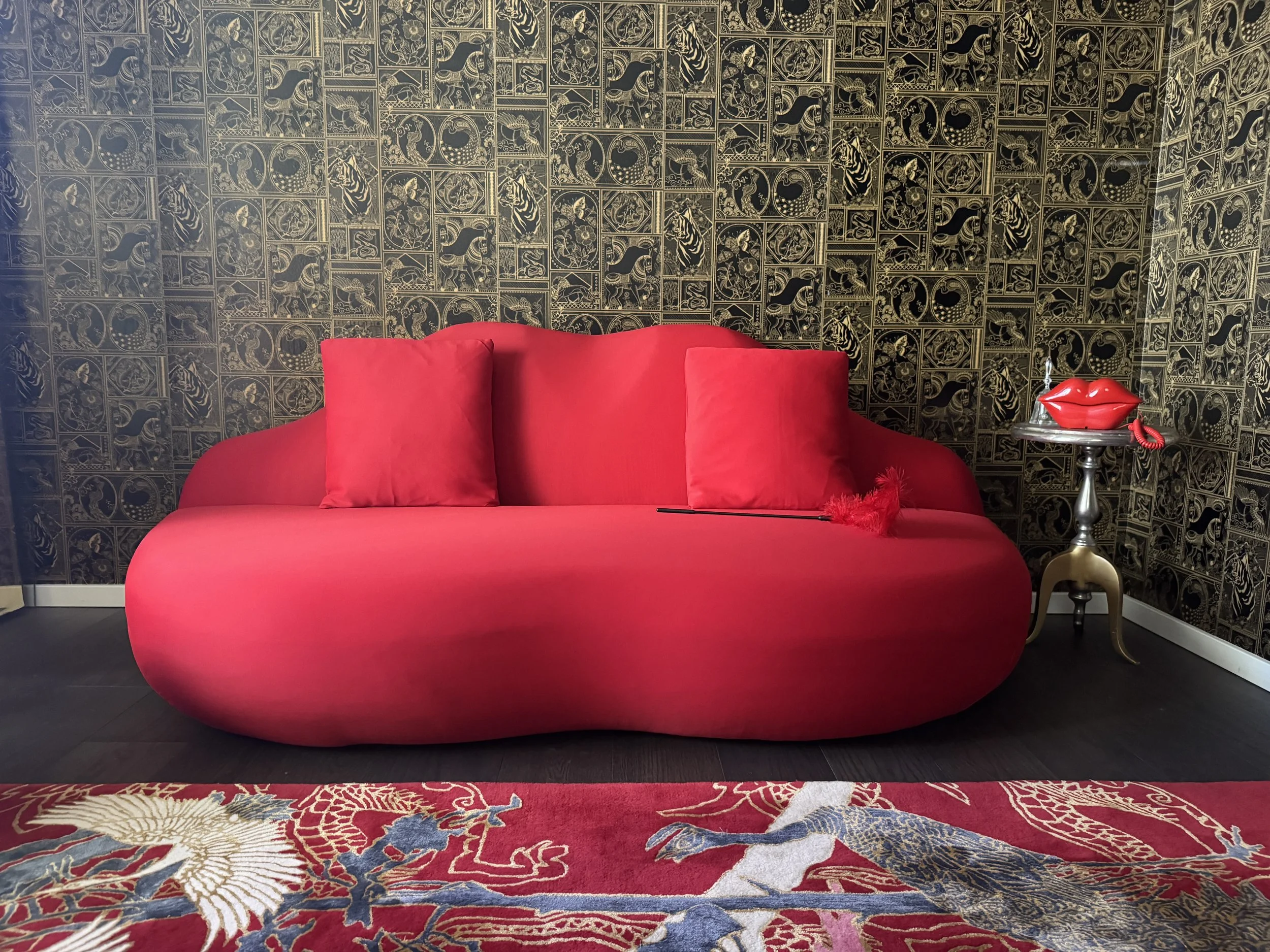 A sensual space with boudoir elegance—the red lips loveseat, a leather tantric spanking chair, and a bookshelf full of erotic inspiration. This boudoir studio is perfect for a burlesque queen or a Dominatrix.